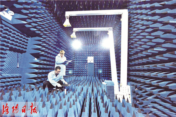 昨日,在位于市先進制造業集聚區的洛陽尖端技術研究院內,科技人員正在微波暗室里進行產品隱身性能測試。