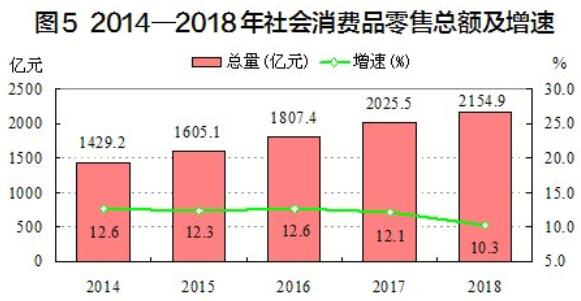 全年社會消費品零售總額2154.9億元,比上年增長10.3%。分城鄉看,城鎮零售額1868.8億元,增長10.2%;鄉村零售額286.1億元,增長10.8%。分行業看,批發和零售業零售額1779.0億元,增長9.8%;住宿和餐飲業零售額375.9億元,增長12.7%。