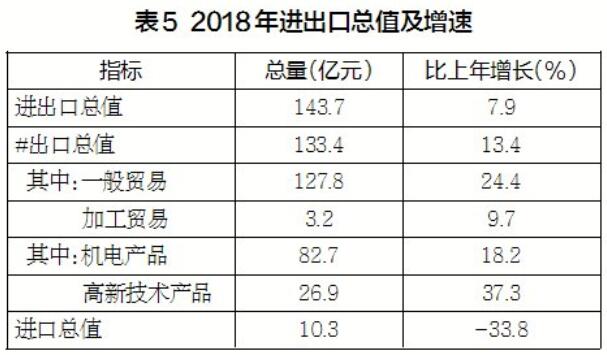 據海關統計,全年進出口總額143.7億元,比上年增長7.9%。其中,出口總額133.4億元,增長13.4%;進口總額10.3億元,下降33.8%。