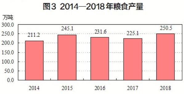 全年糧食產量250.54萬噸,比上年增加25.49萬噸,增長11.3%。其中,夏糧產量118.25萬噸,比上年減少1.60萬噸,下降1.3%;秋糧產量132.29萬噸,比上年增加27.09萬噸,增長25.7%。小麥產量118.14萬噸,比上年減少1.70萬噸,下降1.4%;玉米產量98.99萬噸,比上年增加18.51萬噸,增長23.0%。