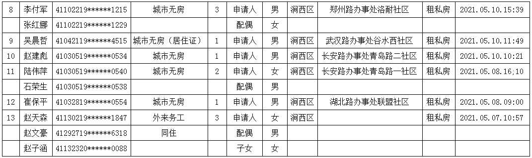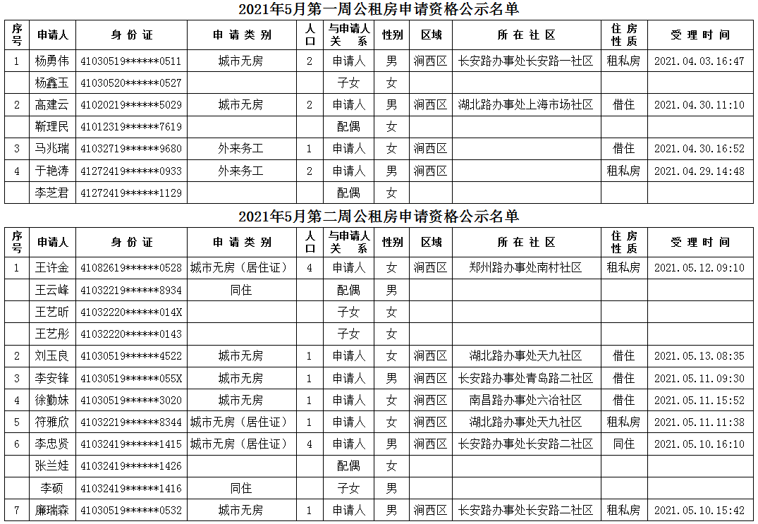 2021年5月第一、二周公租房申請資格公示名單