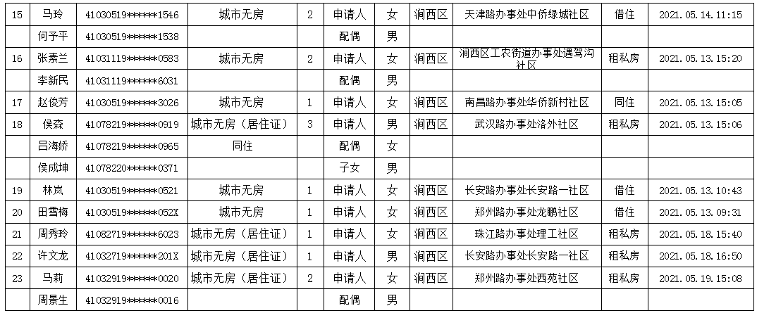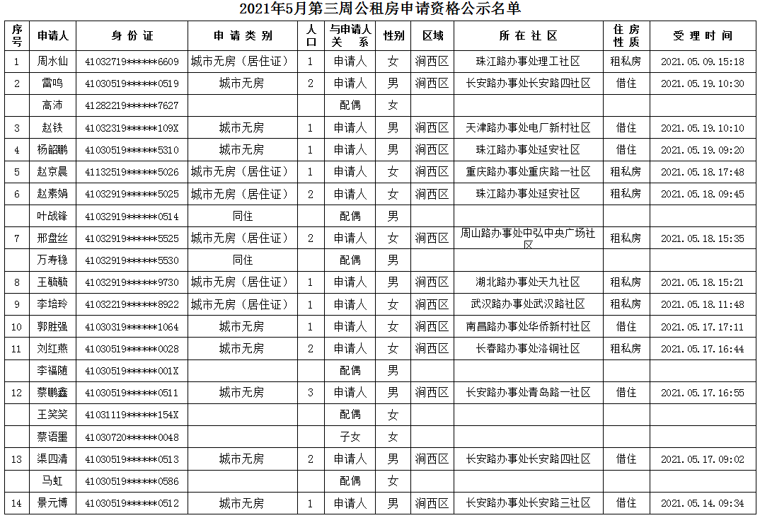 2021年5月第三周公租房申請資格公示名單