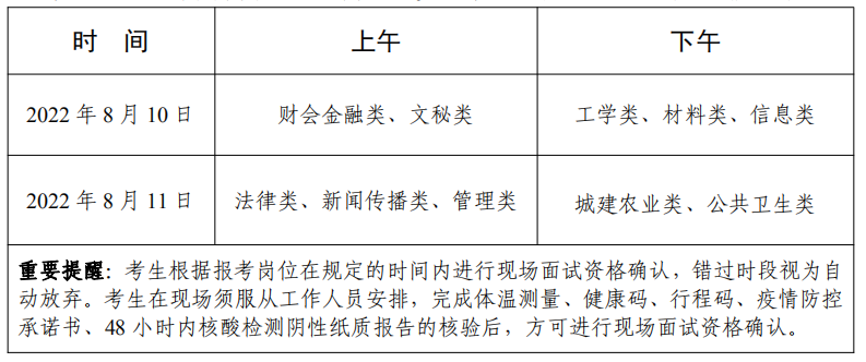 根據當前疫情防控形勢需要,為確保人員不聚集、不扎堆,現場面試資格確認采用分散審核制,2022年8月10日、11日每天上午9:00--12:00,下午13:00--18:00為面試資格確認時間,請考生按規定的時間前往。提前及逾期均不予受理,具體安排如下: