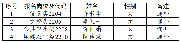 因部分考生放棄體檢、考察出現(xiàn)崗位空缺,從報考同一崗位的人員中,按面試成績從高分到低分的順序依次遞補。第三批進入考察環(huán)節(jié)人選名單如下: