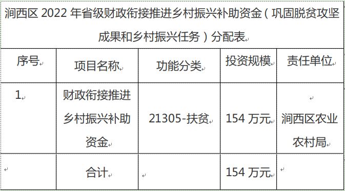 2022年省級財政銜接推進鄉村振興補助資金(鞏固脫貧攻堅成果和鄉村振興任務)154萬元。