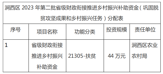 根據(jù)《洛陽(yáng)市財(cái)政局 洛陽(yáng)市鄉(xiāng)村振興局關(guān)于下達(dá)2023年第二批省級(jí)財(cái)政銜接推進(jìn)鄉(xiāng)村振興補(bǔ)助資金(鞏固拓展脫貧攻堅(jiān)成果和鄉(xiāng)村振興任務(wù))指標(biāo)額度的通知》(洛財(cái)農(nóng)〔2023〕51號(hào))文件,下達(dá)我區(qū)省級(jí)財(cái)政銜接推進(jìn)鄉(xiāng)村振興補(bǔ)助資金(鞏固脫貧攻堅(jiān)成果和鄉(xiāng)村振興任務(wù))44萬(wàn)元。現(xiàn)將資金分配使用情況公示如下: