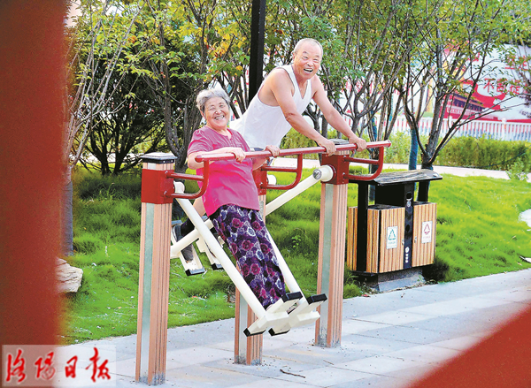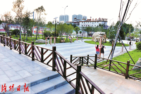 ?在新建成的澗西區秦嶺路街頭游園,不少居民在此健身休閑。