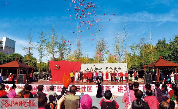“長江黃河,奔流不息,三山五岳,巍峨挺立……”昨日9時30分,澗西區(qū)武漢路社區(qū)文化廣場上正在舉行慶祝國慶文藝演出,一名小女孩在現(xiàn)場動情朗誦詩歌。